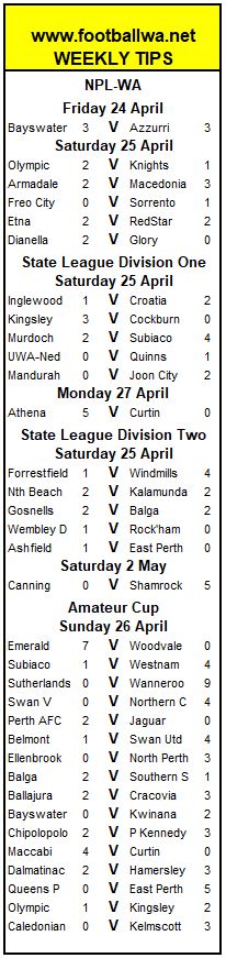 In other games (All kick off at 3:00pm, unless stated) Forrestfield United start life without coach Daryl Platten, who was relieved of his duties in midweek, when they host Morley Windmills at Luxwin Stadium, Hartfield Park, both sides looking to bounce back, while league leaders Rockingham City head to Butlers Reserve, to take on third placed Wembley Downs, with both sides aiming to keep their unbeaten start to the season intact. (5:00pm) North Beach will look to back up from last weeks first win in the State League, when they host Kalamunda City at Charles Riley Memorial Reserve, Gosnells City entertain Balga at Walter Padbury Reserve, while in the final game, the other unbeaten side Carramar Shamrock Rovers head to Burrendah Park to take on Canning City.